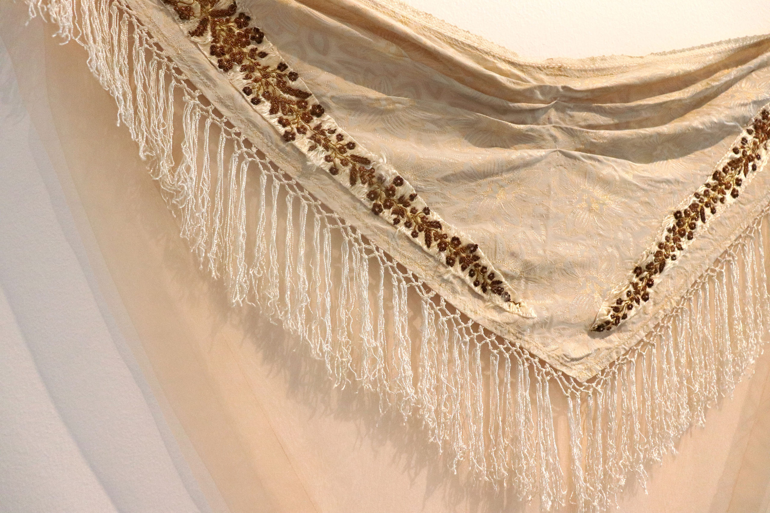Old scarf (from Bad Gastein), fabric, organdy, paper clay, threads, plastic rings