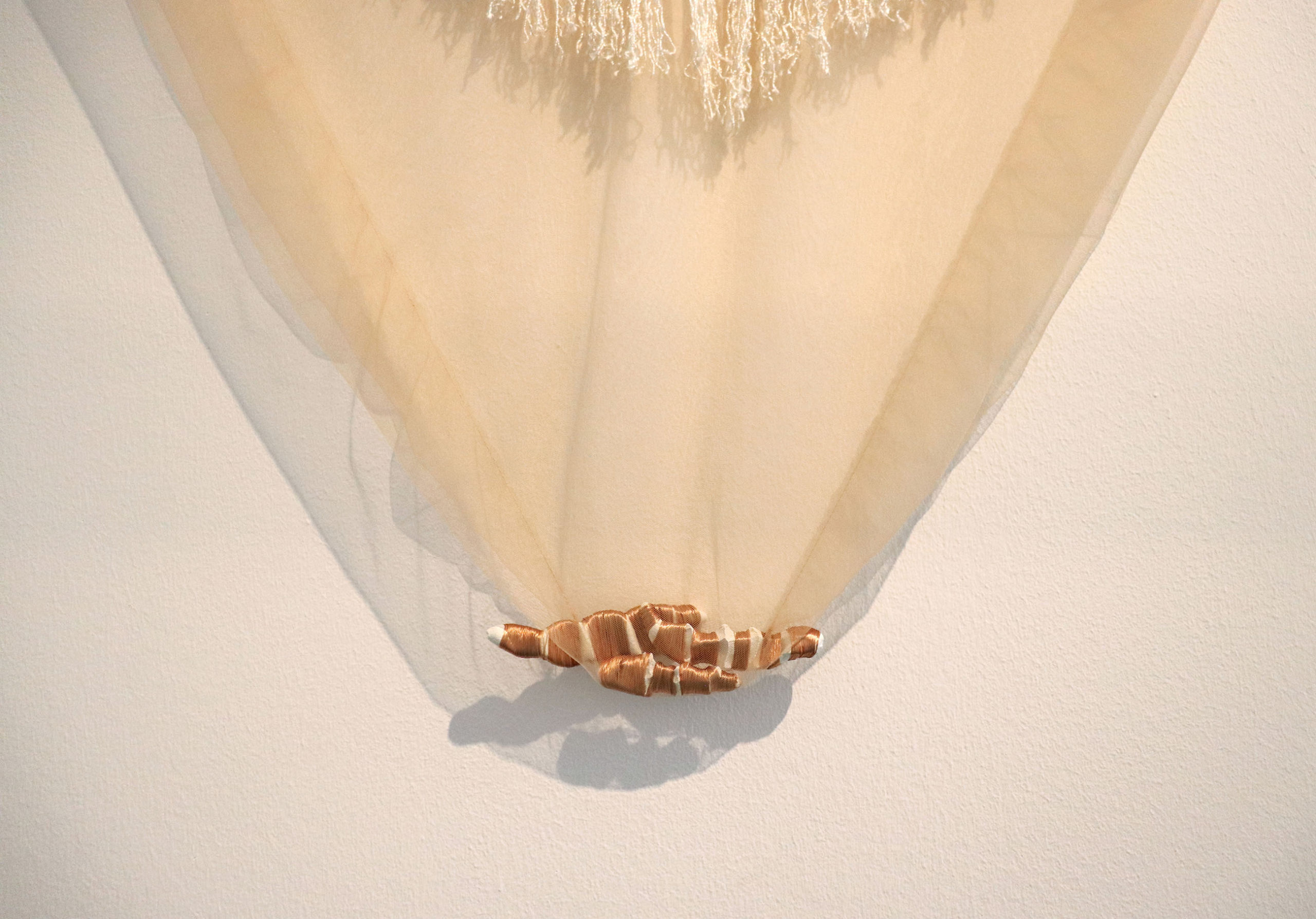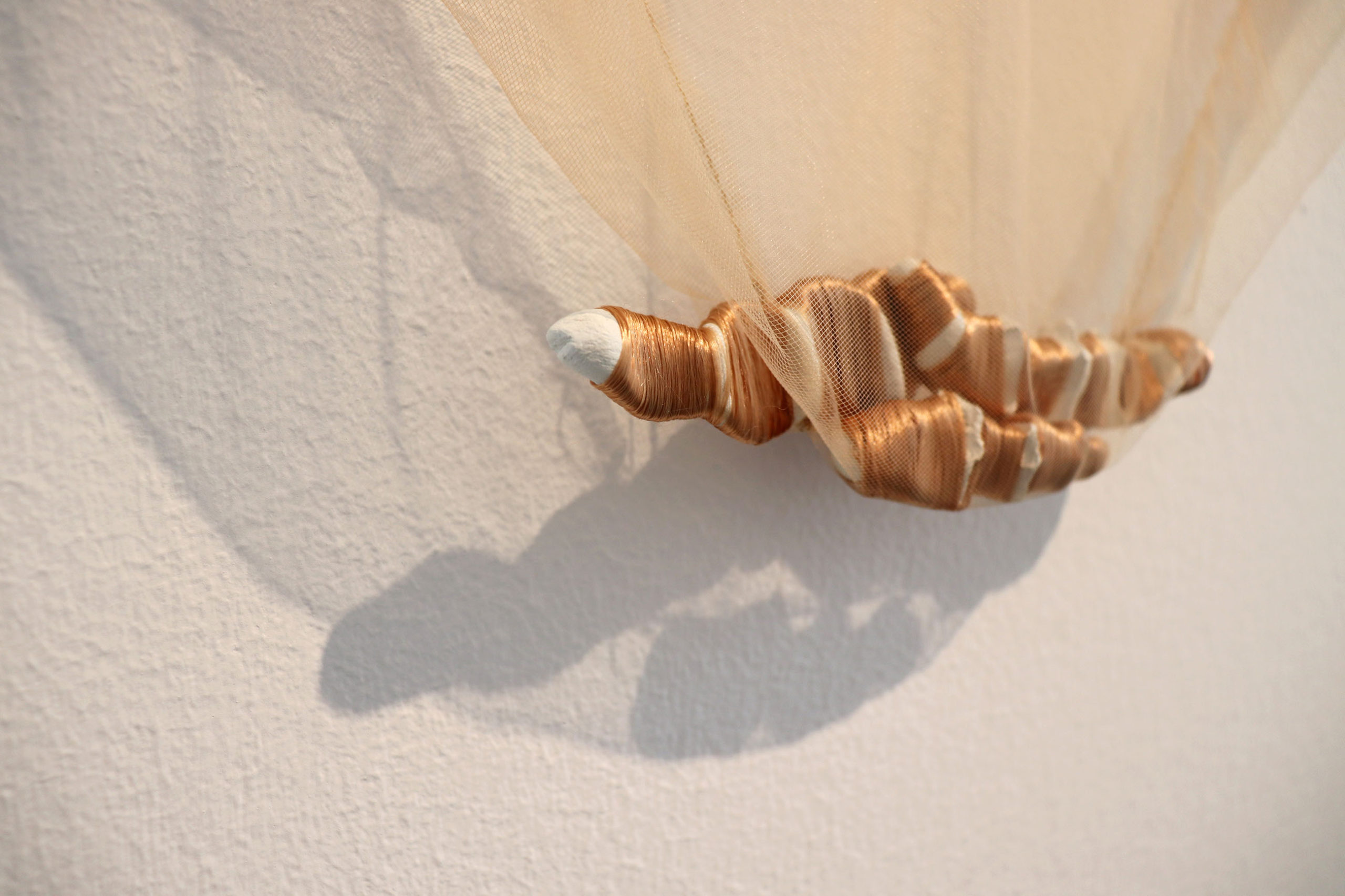 The boat-like shape is an old scarf, estimated to be about 50 years old. The delicate decorations have been hand-sewn and arranged, leaving behind liquid stains and a faint body odour. The object in the organza bag is a negative print of my fist made of paper clay.