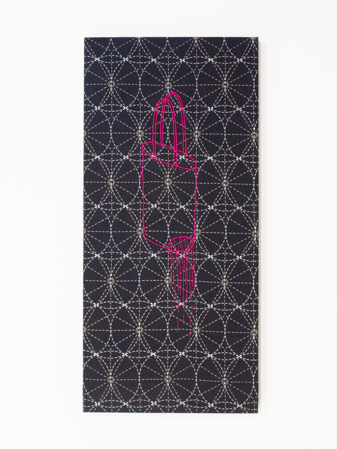 Left: KOGIN embroidery (Taisho period, the beginning of 20th century in Japan) Right: embroidery by the artist on modern cloth made specifically for practicing the traditional stitching technique KOGIN inherited in the northern region of Japan, wooden panel