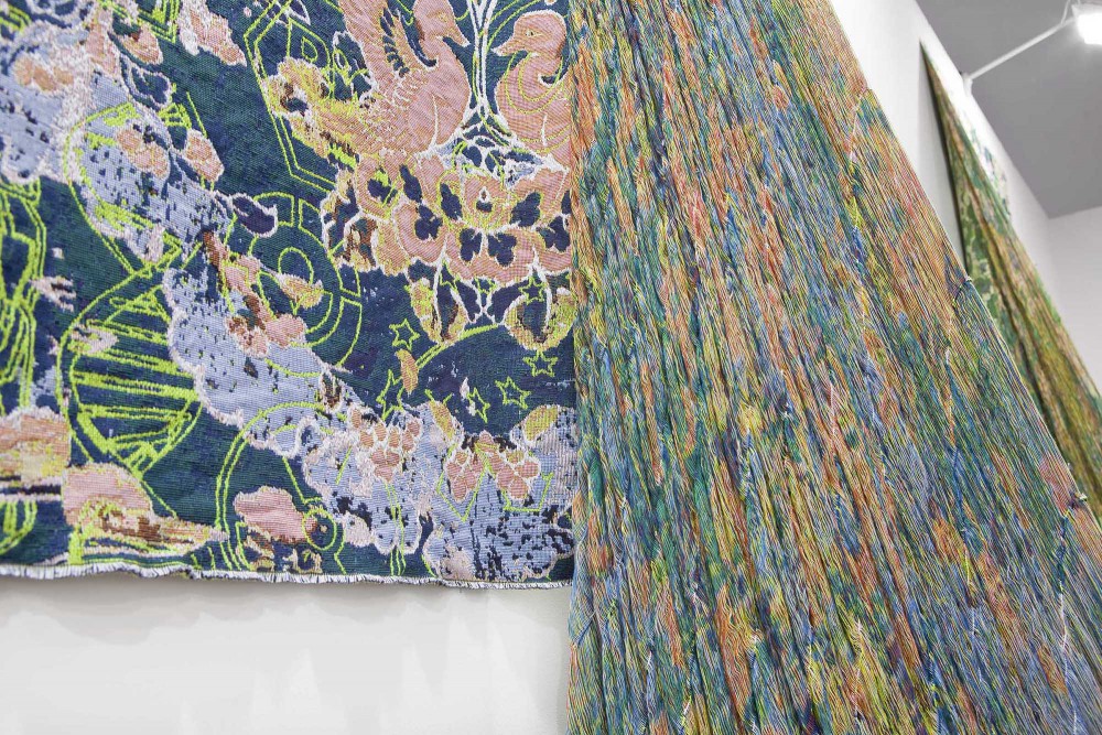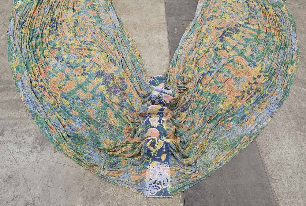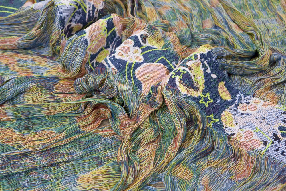 The fabric refers to Stand cover (kyokechi-dyed fabric) in the 8th century in Japan and contemporary symbols are sprinkled over the traditional fabric as a part of flowers. The contemporary symbols that are surrounding us in the society are quoted from copyright mark, @ mark, nuclear symbol, bio mark, peace mark, credit card company symbols, gene image, irradiated mark, placenta image, womb image, biohazard mark and etc.
