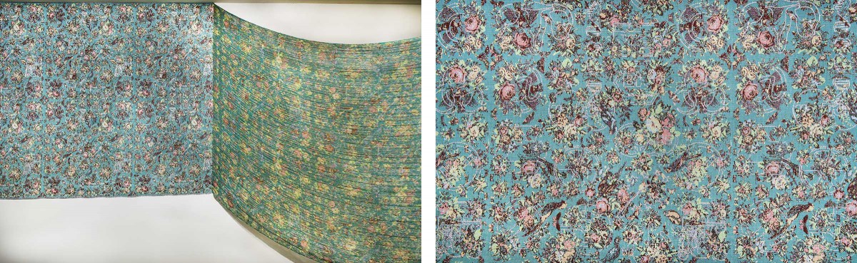 The fabric refers to Beadwork tablecloth in Penang (Malaysia) in the early 20th century and contemporary symbols are sprinkled over the traditional fabric as a part of flowers. The contemporary symbols that are surrounding us in the society are quoted from copyright mark, @ mark, nuclear symbol, bio mark, peace mark, credit card company symbols, gene image, irradiated mark, placenta image, womb image, biohazard mark and etc.