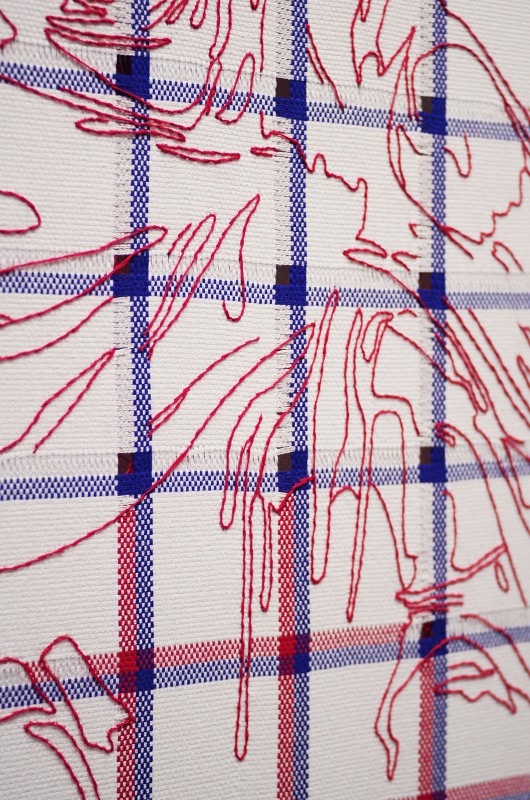赤と青の格子柄の布から赤い糸だけを引き抜き、その糸を元の布から切り離すことなくそのまま刺繍に用いています。刺繍の内側の格子部分には赤い糸は残っていません。この刺繍のモチーフは、水月観音半跏像(東慶寺、鎌倉時代)から引用されていて、その仏像の衣服の襞部分を抜き出して刺繍にしています。