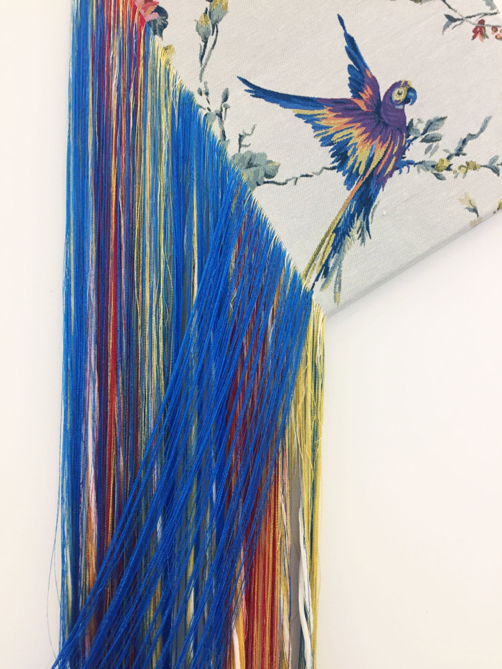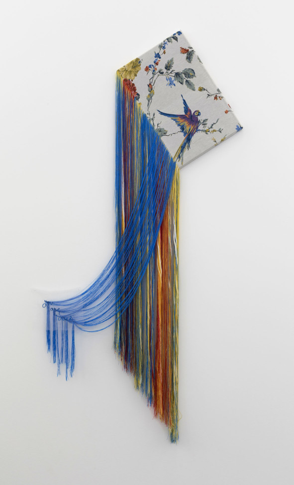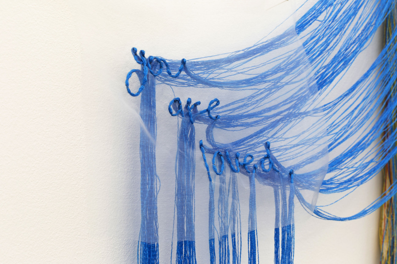 Talisman (you are loved) 2018 Embroidery with the threads extracted from readymade fabric H.165 x W.85 x D.4 cm (installation height 238 cm) Exhibited at Fragments of Thoughts, Mikiko Sato Gallery, Hamburg, Germany (2018) Photo by Andreas Weiss