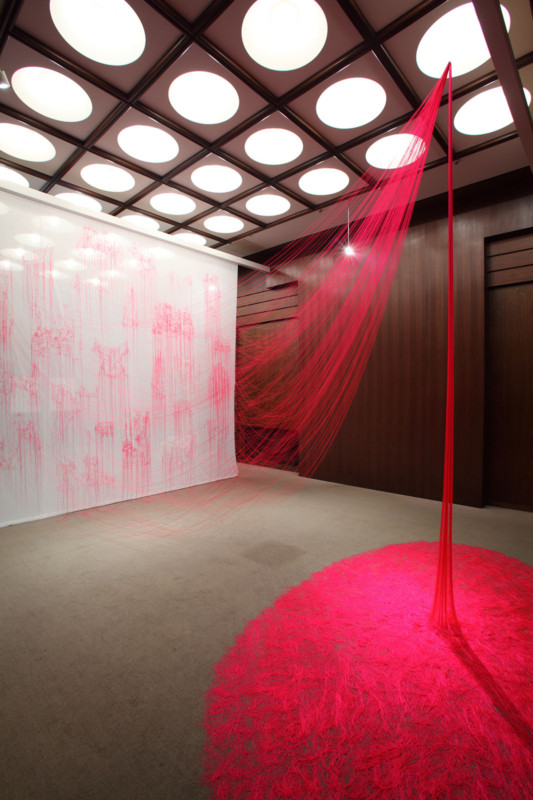 The threads extending from embroideries are forming a fluorescent-pink puddle behind of the cloth. On the front side, there are 25 embroidery images, referring to various fine arts and non-art such as ancient sculptures, masterpieces of European painting, cat’s cradle (play), ancient Egyptian clothes, a Chinese landscape painting, a painting of Japanese ancient furniture, illustrations of knitting in the present period and so on. These motifs are gathered intentionally across the realms of high art and non-art because I wanted to look into the “fountain of creation” itself and connections behind the artificially imposed stratification of art as painting, sculpture, craft, design, non-art, music, dance, poem, performance, writing and so on.
